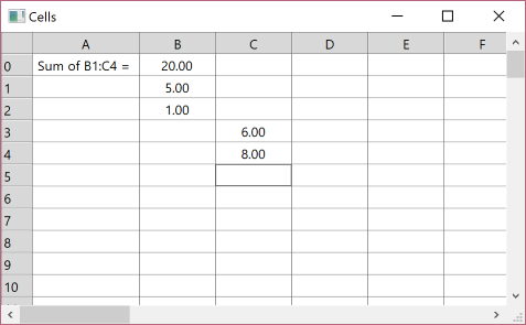 In the screnshot cell B0 value is "=sum(B1:C4)". The values can be empty, a number, a string or a formula. Formulas start with "=". But for simplicity the sample supports only the "=sum(XY:XY)" formula format.