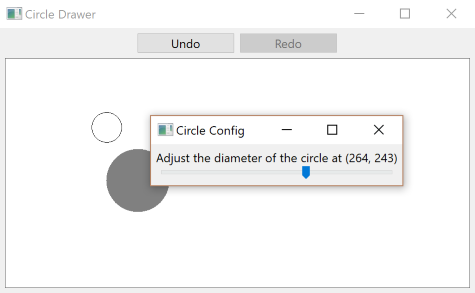 The task is to build a frame containing an undo and redo button as well as a canvas area underneath. Left-clicking inside an empty area inside the canvas will create an unfilled circle with a fixed diameter whose center is the left-clicked point. The circle nearest to the mouse pointer such that the distance from its center to the pointer is less than its radius, if it exists, is filled with the color gray. The gray circle is the selected circle C. Right-clicking C will make a popup menu appear with one entry “Adjust diameter..”. Clicking on this entry will open another frame with a slider inside that adjusts the diameter of C. Changes are applied immediately. Closing this frame will mark the last diameter as significant for the undo/redo history. Clicking undo will undo the last significant change (i.e. circle creation or diameter adjustment). Clicking redo will reapply the last undoed change unless new changes were made by the user in the meantime."