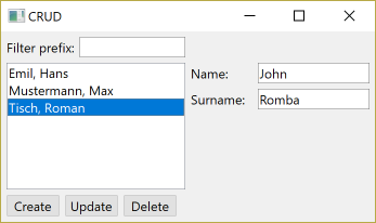 The task is to build a frame containing the following elements: a textfield Tprefix, a pair of textfields Tname and Tsurname, a listbox L, buttons BC, BU and BD and the three labels as seen in the screenshot. L presents a view of the data in the database that consists of a list of names. At most one entry can be selected in L at a time. By entering a string into Tprefix the user can filter the names whose surname start with the entered prefix—this should happen immediately without having to submit the prefix with enter. Clicking BC will append the resulting name from concatenating the strings in Tname and Tsurname to L. BU and BD are enabled iff an entry in L is selected. In contrast to BC, BU will not append the resulting name but instead replace the selected entry with the new name. BD will remove the selected entry. The layout is to be done like suggested in the screenshot. In particular, L must occupy all the remaining space."