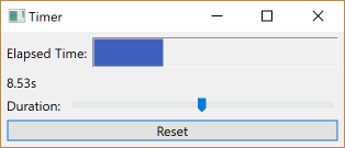 The task is to build a frame containing a gauge G for the elapsed time e, a label which shows the elapsed time as a numerical value, a slider S by which the duration d of the timer can be adjusted while the timer is running and a reset button R. Adjusting S must immediately reflect on d and not only when S is released. It follows that while moving S the filled amount of G will (usually) change immediately. When e ≥ d is true then the timer stops (and G will be full). If, thereafter, d is increased such that d > e will be true then the timer restarts to tick until e ≥ d is true again. Clicking R will reset e to zero."